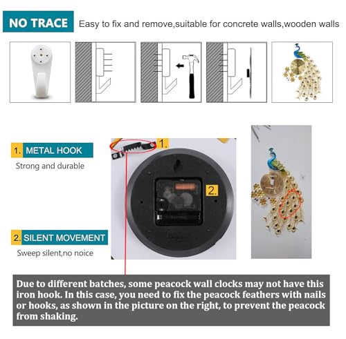 - [Material de reloj de pavo real]: Los relojes de pared de pavo de pavo de luxero están hechos de ramas de hierro, diamantes de imitación acrílica brillante, de resina, metal duradero con laca a alta temperatura, marcación de metal, puntero de reloj de metal. No deformación, sin desvanecimiento, fácil de operar, fácil de operar, fácilpara leer.
